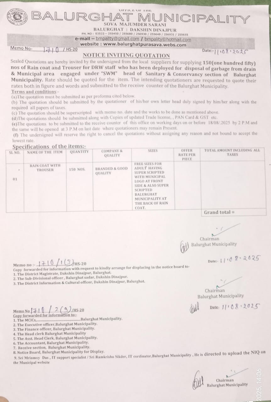 NIQ for Supplying of 150 Nos. of Rain Coat and Trouser for DRW staff who has been deployed for disposal of Garbage from Drain & Municipal area engaged under SWM head of Sanitary & Conservancy section of Balurghat Municipality.