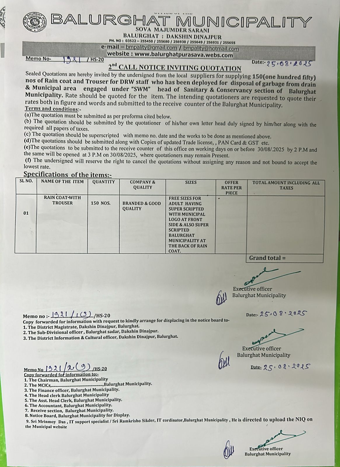 NIQ (2nd Call) for Supplying of 150 Nos. of Rain Coat and Trouser for DRW staff who has been deployed for disposal of Garbage from Drain & Municipal area engaged under SWM head of Sanitary & Conservancy section of Balurghat Municipality.